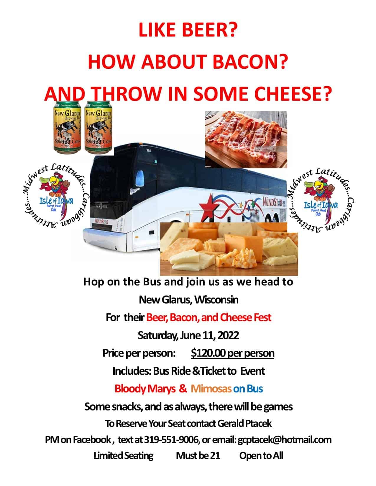 Bus Trip to Beer, Bacon and Cheese Fest Share this post: Share on X (Twitter) Share on Facebook Share on Pinterest Share on LinkedIn Share on Email + Add to Google Calendar + iCal / Outlook export The event is finished. Date Jun 11 2022 Expired! Time All Day Cost $120.00 Category Bus Trips Organizer Isle of Iowa Parrot Head Club Website https://isleofiowa.com Share this event