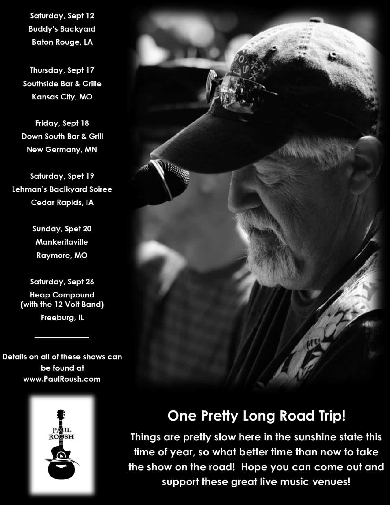 Paul Roush House Concert BYOB, Food, Chair. $15 goes to musician. Meet and greet starts at 4pm. Lots of space to spread out and enjoy the music! Share this post: Share on X (Twitter) Share on Facebook Share on Pinterest Share on LinkedIn Share on Email + Add to Google Calendar + iCal / Outlook export The event is finished. Date Sep 19 2020 Expired! Time 4:30 pm - 7:30 pm Cost $15 Location Lehmans Backyard Soiree 5050 Valley View Dr Category Charity Event Share this event