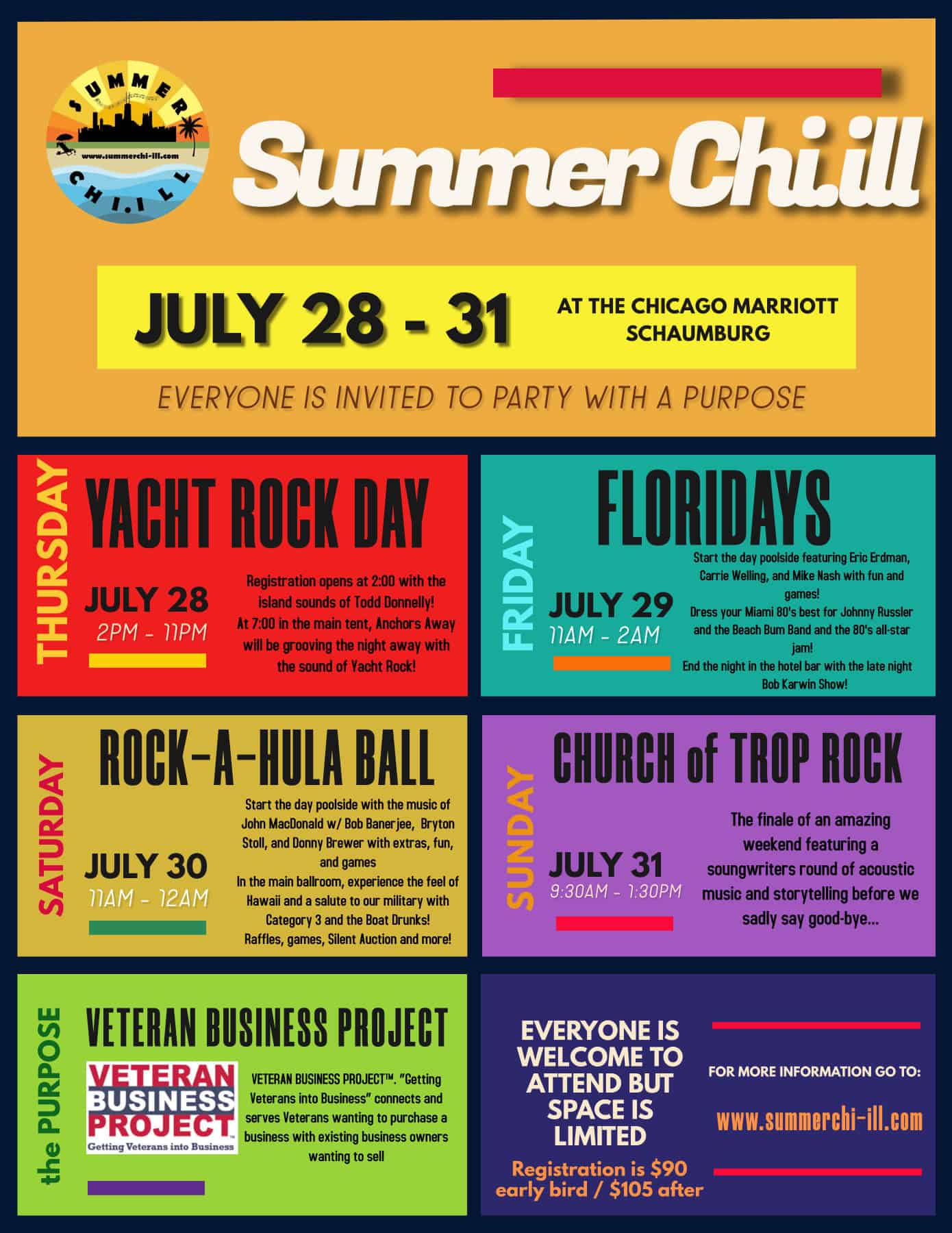Summer Chi.ill Share this post: Share on X (Twitter) Share on Facebook Share on Pinterest Share on LinkedIn Share on Email + Add to Google Calendar + iCal / Outlook export The event is finished. Date Jul 28 - 31 2022 Expired! Time All Day Category Phlocking Organizer Chicago Parrot Head Club Website https://www.chicagoparrotheads.com/ Share this event