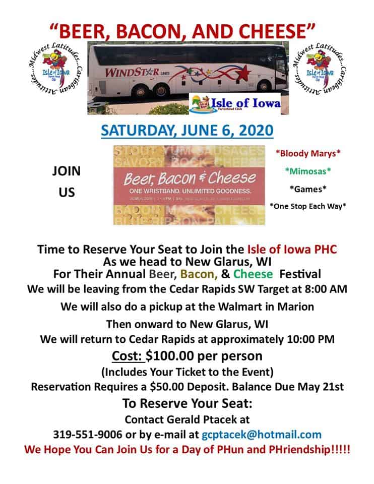 to New Glarus in Wisconsin. Cost $100 per person, deposit due by May
