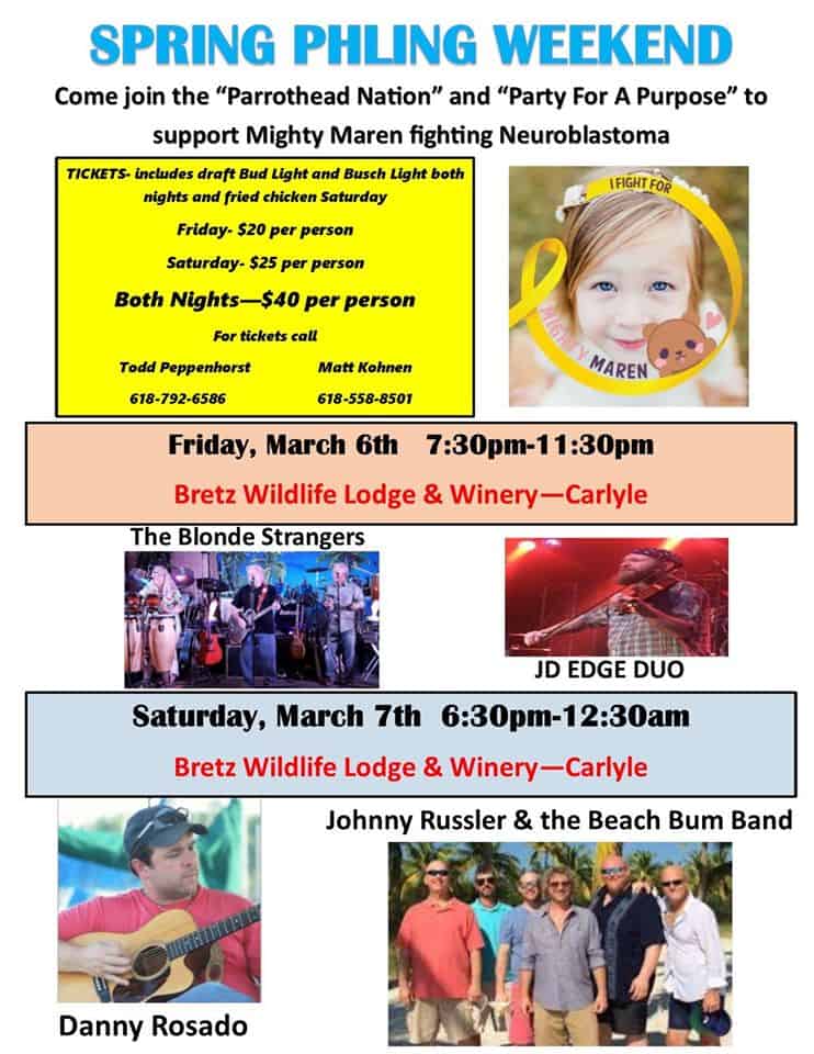 Mar 6-7: Bretz Wildlife Winery, Carlyle at 15469 State Route 127 in Carlyle, Illinois. Hosted by Clinton County Parrothead Club. Friday features JD Edge and a special guest. Saturday features Danny Rosado and Johnny Russler and the Beach Bum Band. Details: https://www.facebook.com/events/759685894549142/